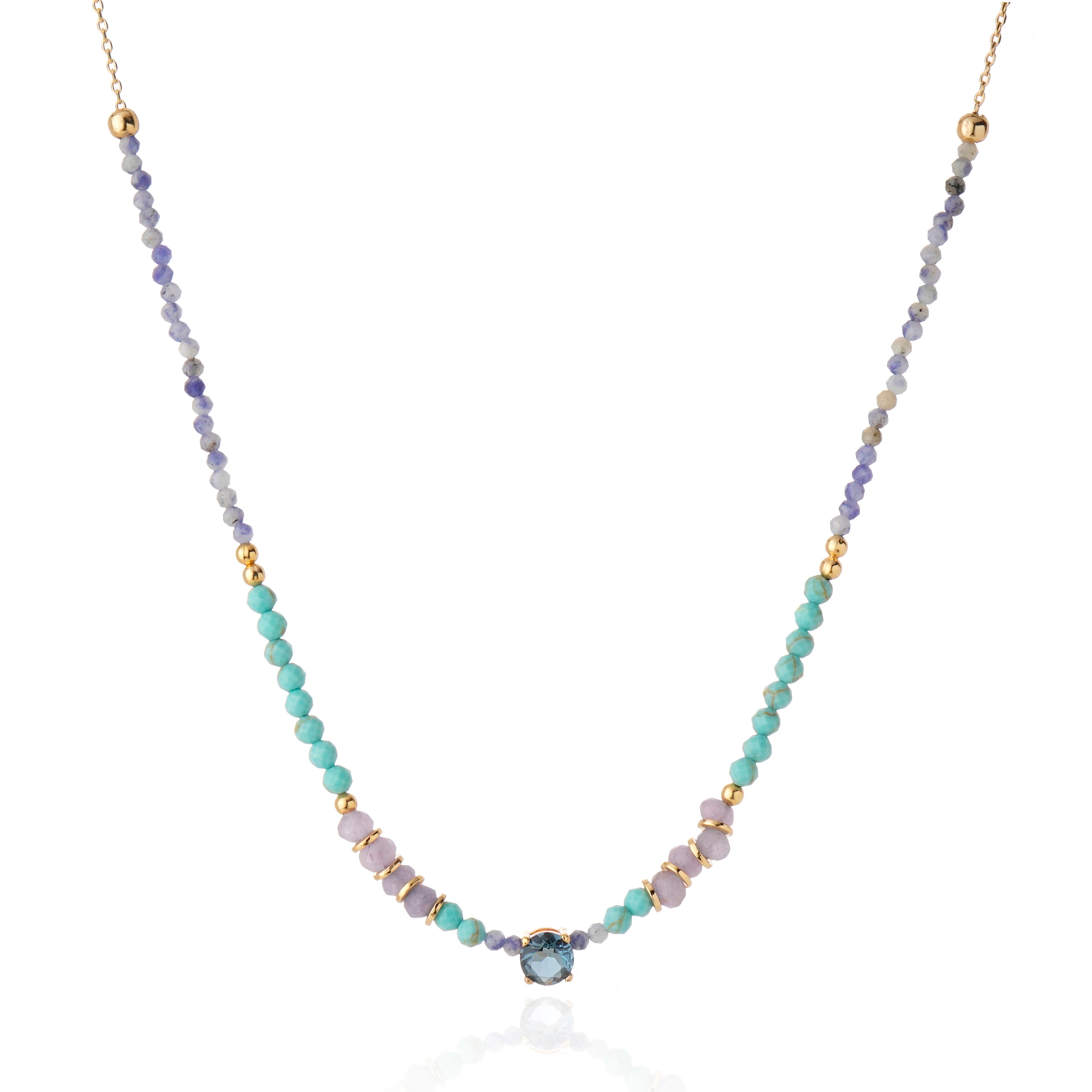 Colar delicado composto por pedras naturais facetadas em tons de lilás e turquesa, intercaladas por esferas metálicas. Possui detalhe central com cristal lapidado, com banho em ouro 18k. Corrente fina com fecho e extensor, permitindo ajuste de comprimento. Acabamento cuidadoso e montagem artesanal.