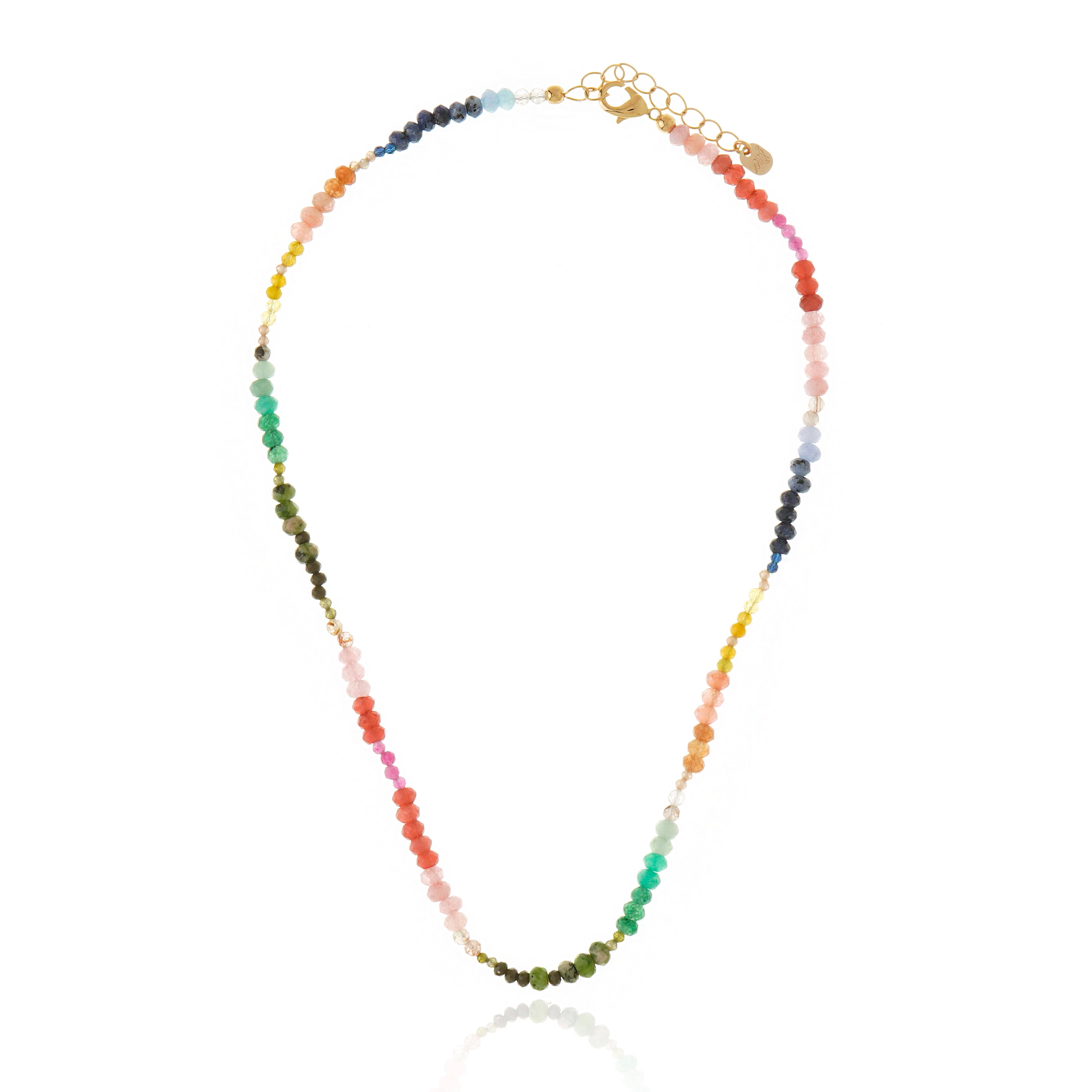 Colar composto por pedras naturais lapidadas em tons variados, formando uma composição multicolorida. Possui componentes metálicos com banho em ouro 18k, fecho tipo lagosta e extensor para ajuste de comprimento. Montagem artesanal e acabamento delicado.