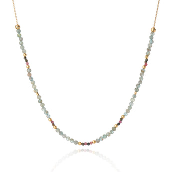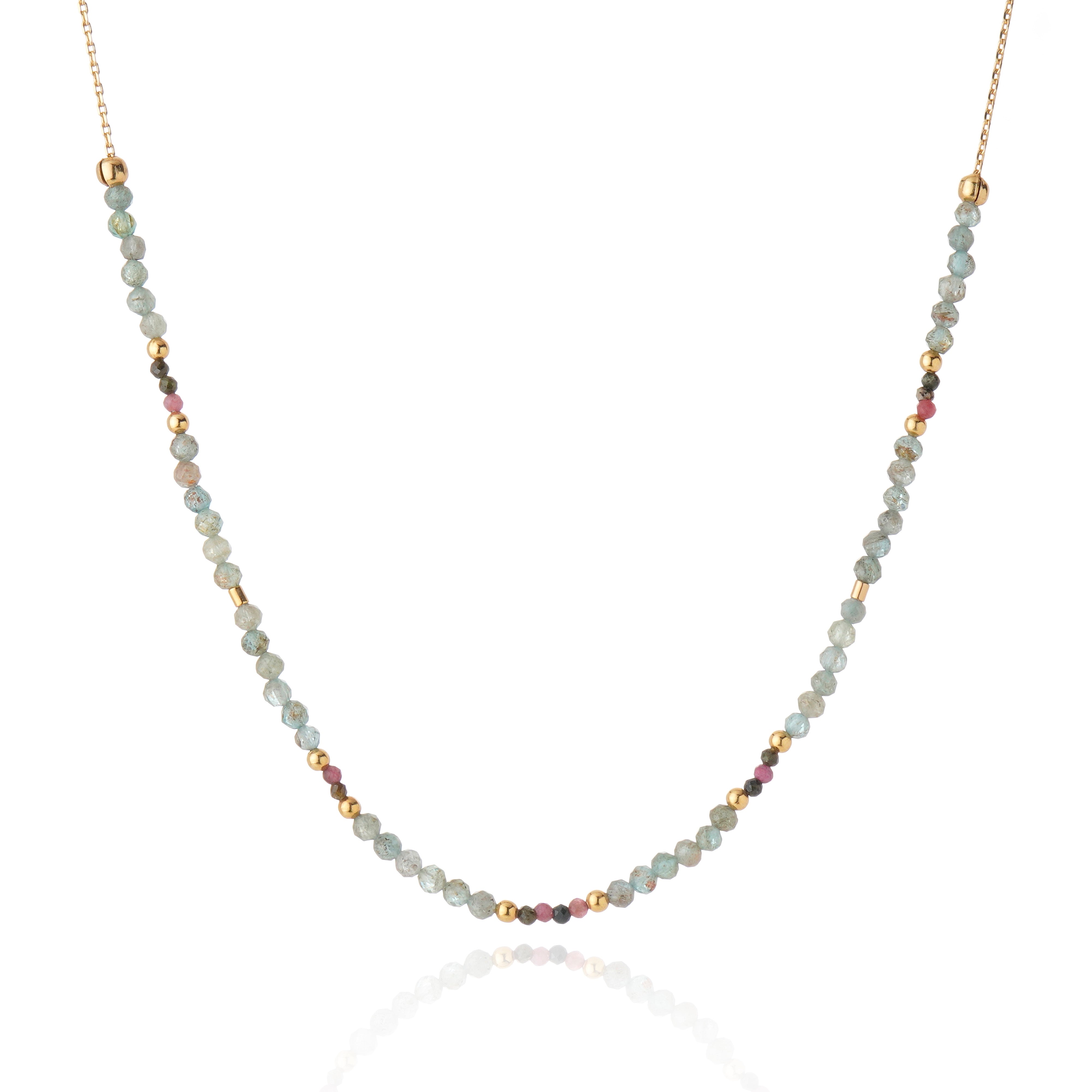 Um colar que celebra a beleza natural das cores em sua forma mais sutil. As pedras naturais, cuidadosamente lapidadas, criam uma harmonia suave e elegante, iluminada por pequenos detalhes dourados. Leve, delicado e atemporal, é a peça perfeita para acompanhar o cotidiano com sofisticação discreta — sozinho ou em composição com outros colares.