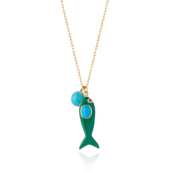 Um colar que celebra símbolos, cor e delicadeza. O pingente em forma de Sardinha surge com acabamento esmaltado em tom vibrante, combinado à turquesa e a um ponto sutil de brilho, criando um contraste elegante e cheio de personalidade. Uma joia leve, charmosa e contemporânea.