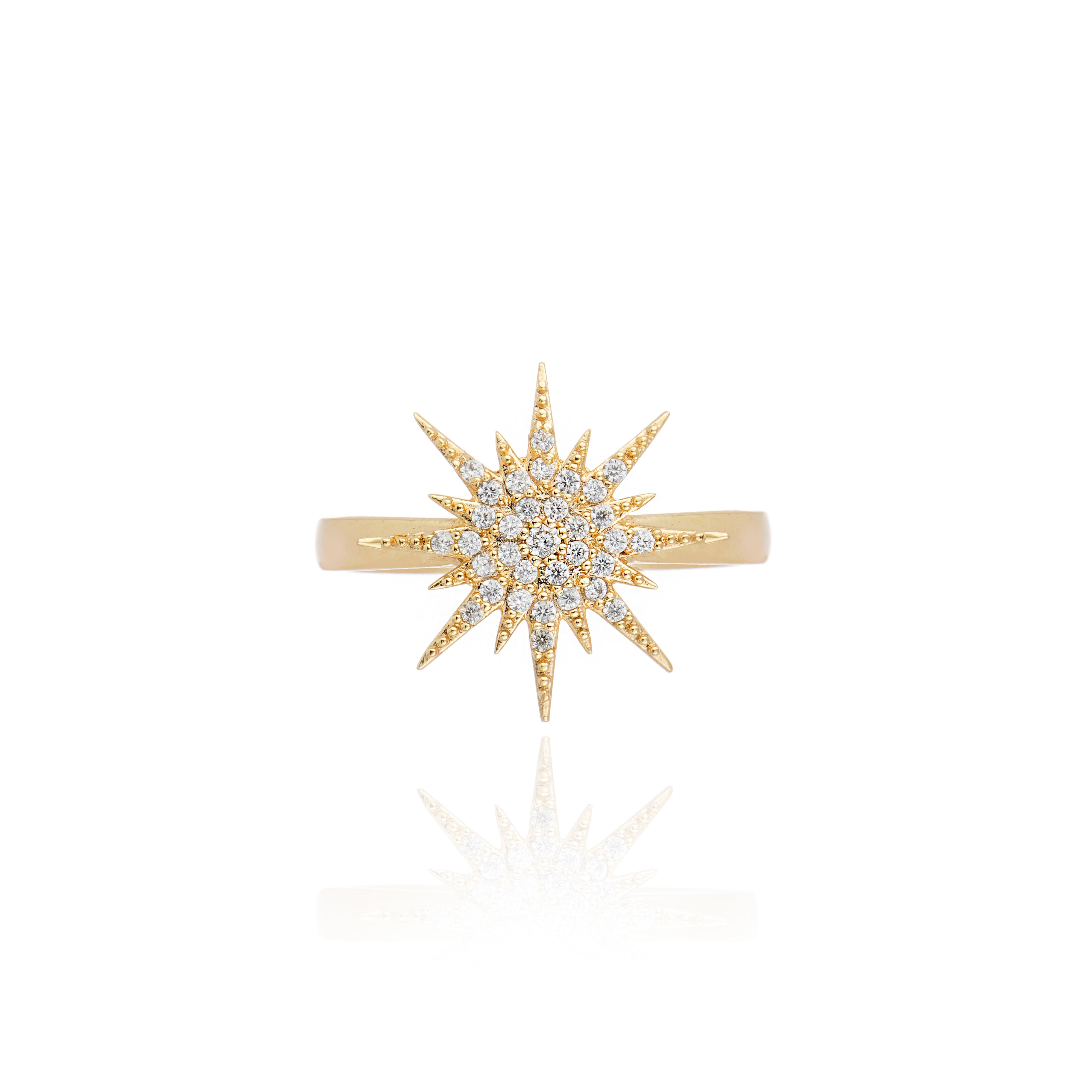 O Anel Estrela foi produzido artesanalmente, aplicando as técnicas da joalheria, no banho ouro, com zircônias cravejadas manualmente.