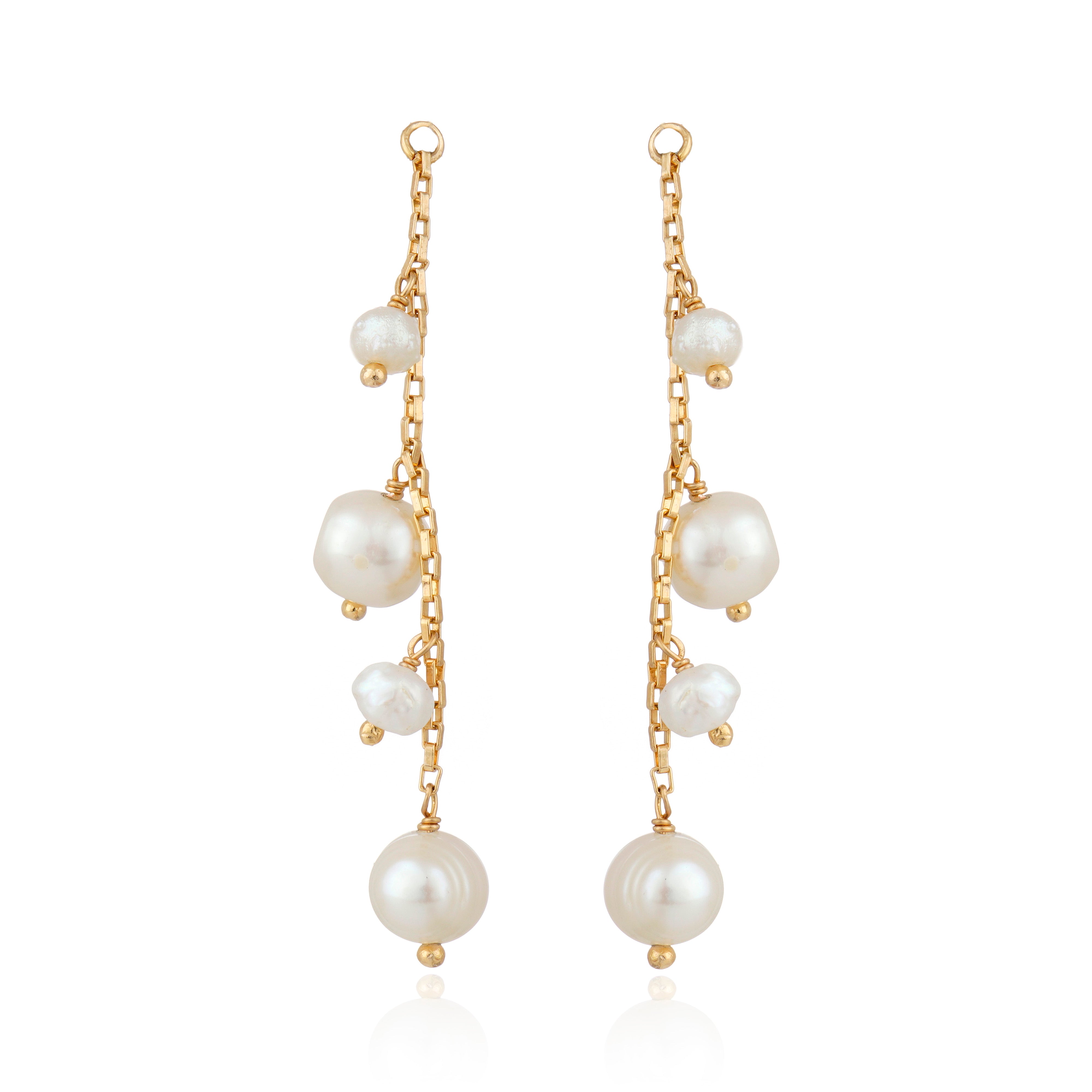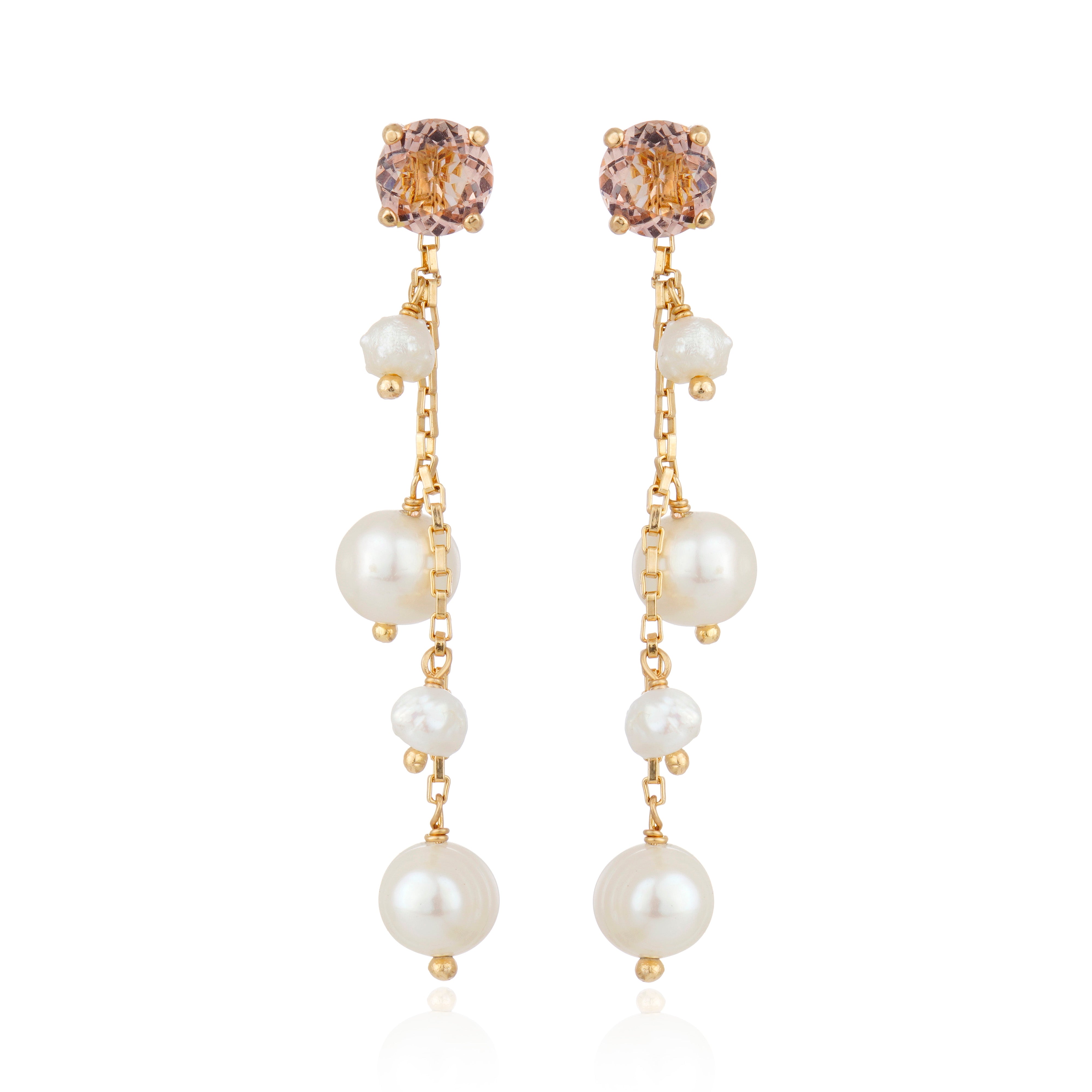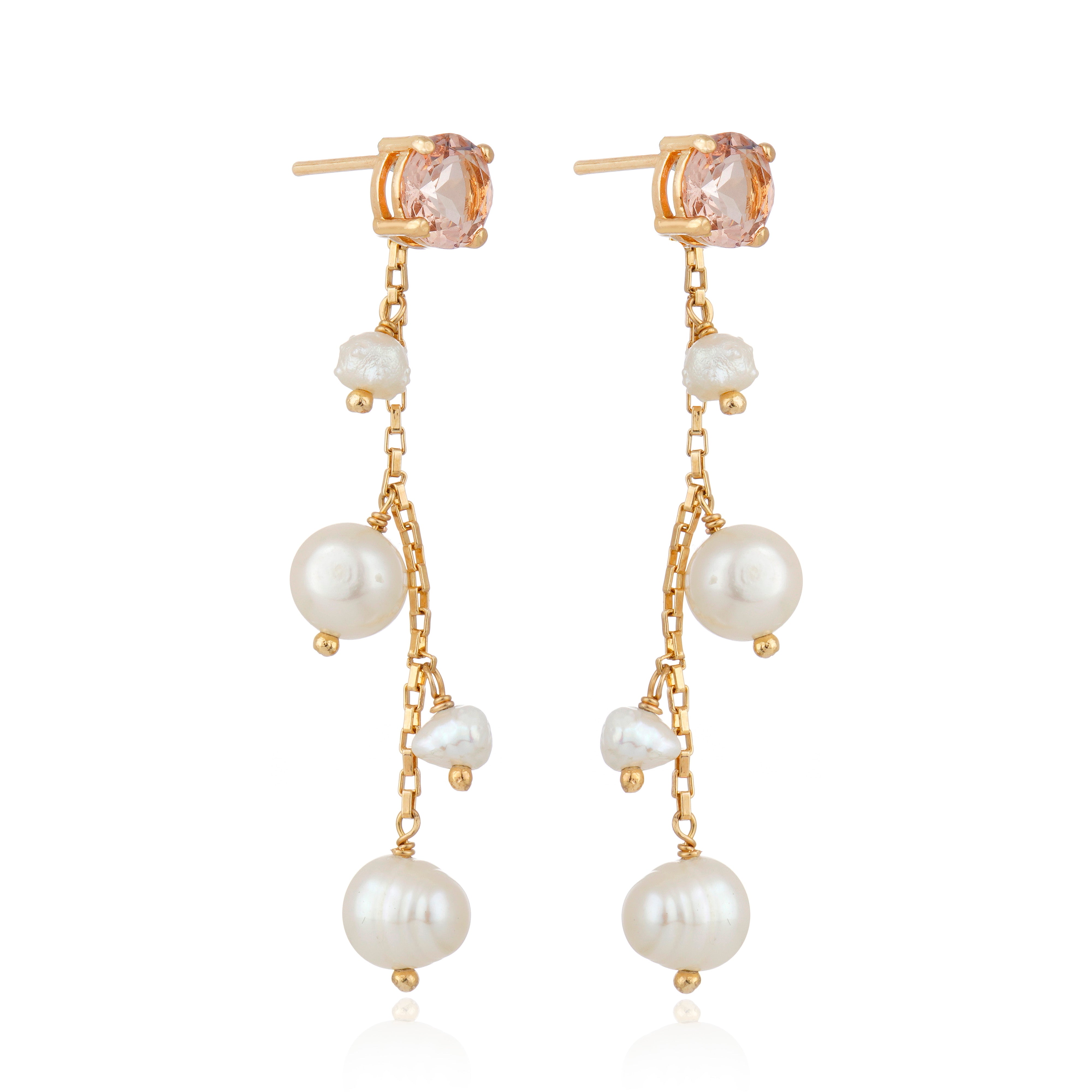 Brinco modular composto por base de cristal lapidado e corpo removível com corrente delicada e pérolas naturais de água doce em diferentes formatos.