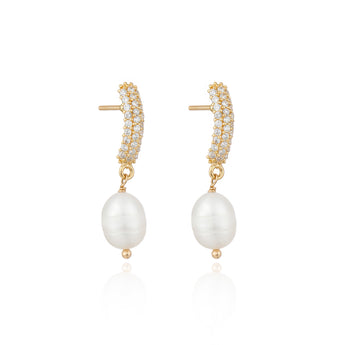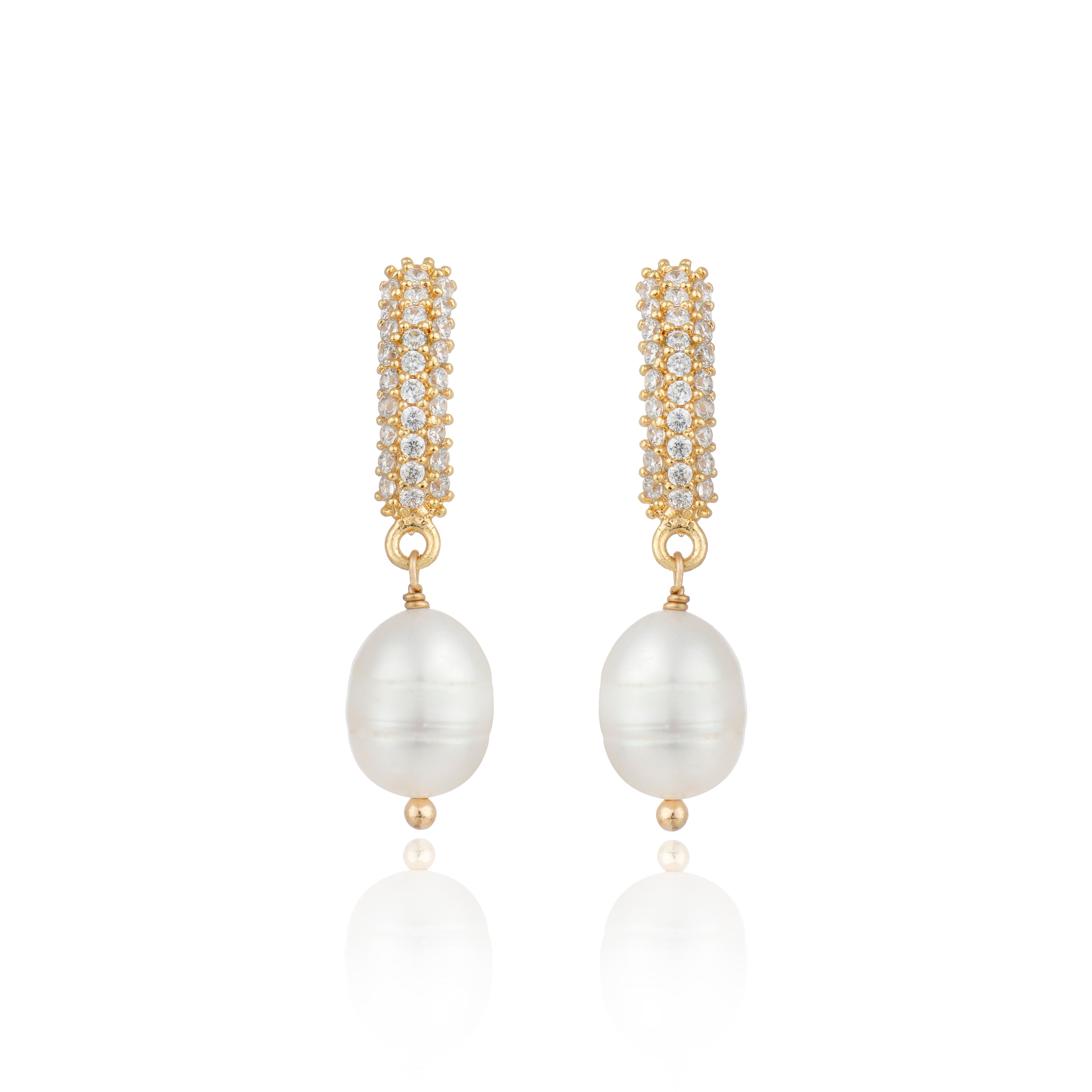 Brinco com base de zircônia cravejadas e pingente de pérola natural de água doce.