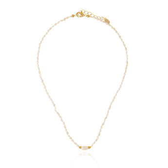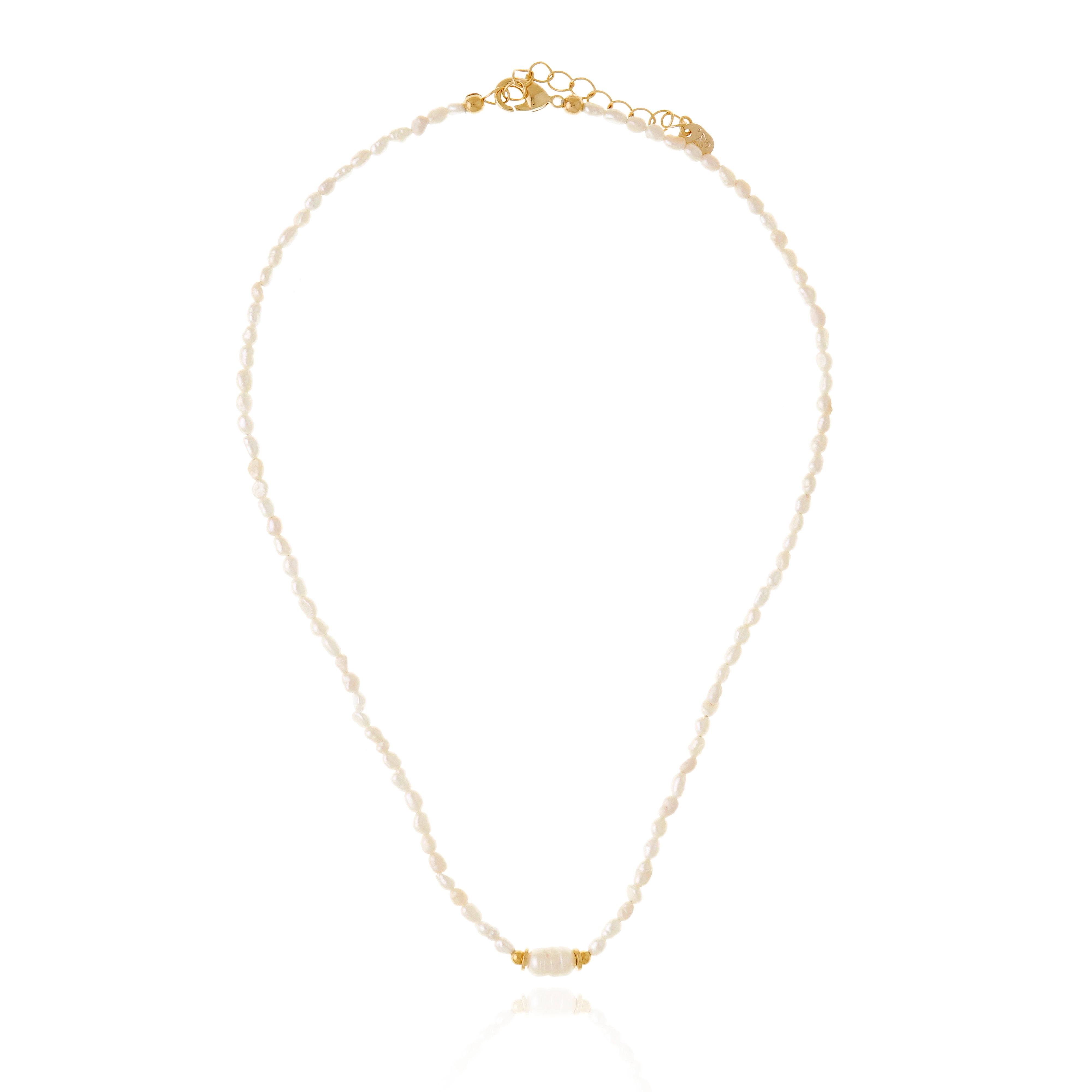 Colar confeccionado com pérolas barrocas naturais em formato arroz, selecionadas uma a uma. Possui detalhe central em pérola barroca levemente maior, criando equilíbrio visual no design. Montagem artesanal com fecho ajustável em metal com banho de ouro 18k. Por se tratarem de pérolas naturais, cada peça apresenta variações únicas de forma e textura.
