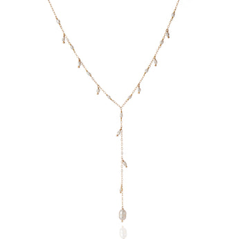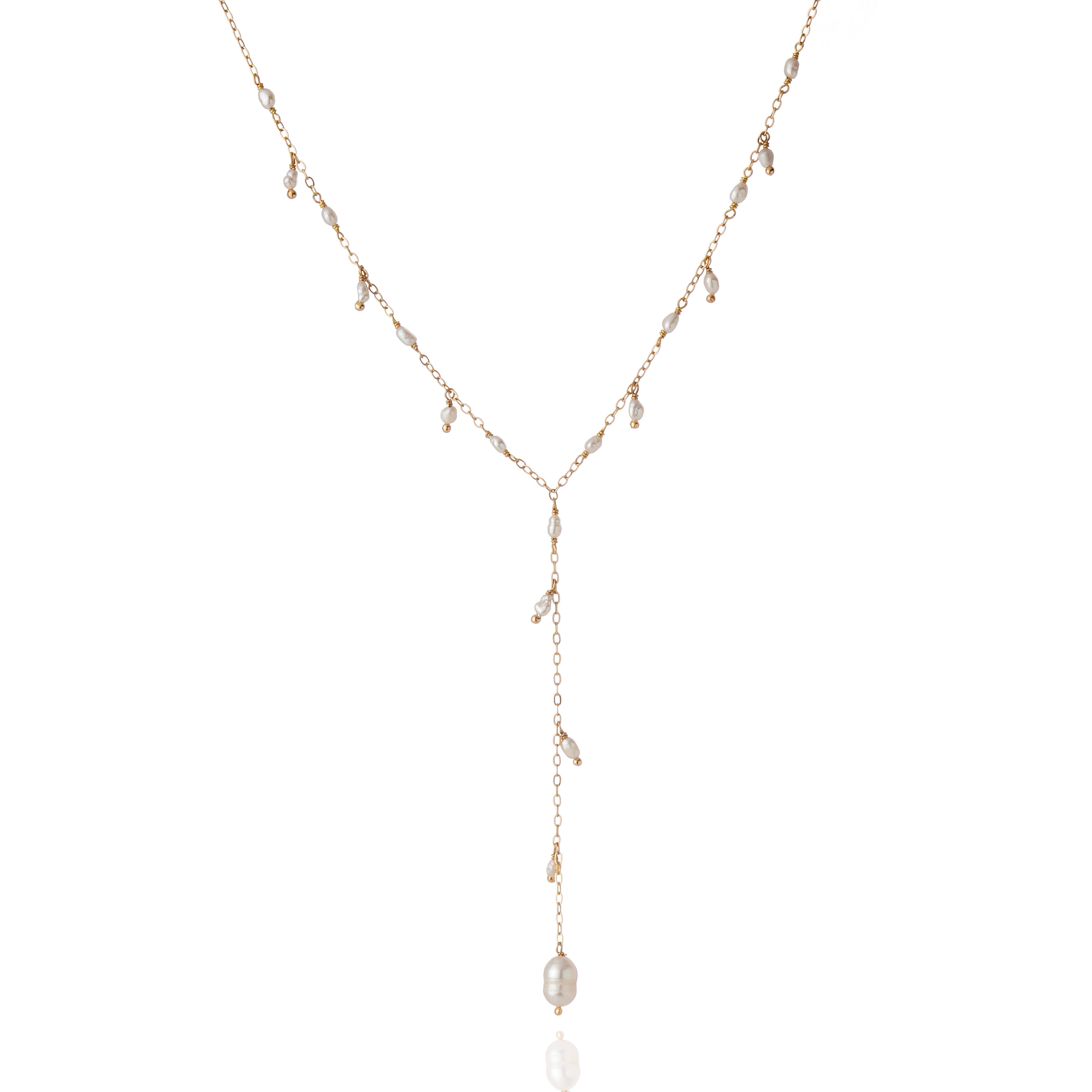 Colar composto por corrente delicada, formato de gravatinha com pérolas barrocas em formato arroz, distribuídas ao longo da peça. Possui componentes metálicos com banho em ouro 18k e extensor para ajuste de comprimento. Montagem artesanal e acabamento refinado.